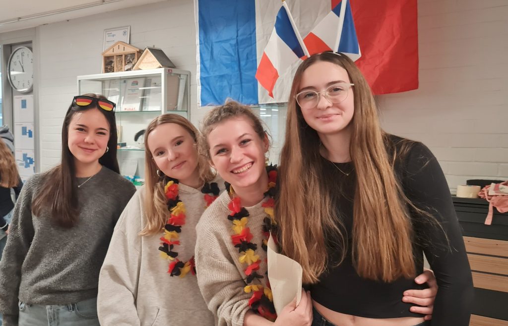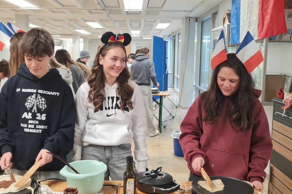 Am 22. Januar 2026, anlässlich des 63. Jahrestags der Unterzeichnung des deutsch-französischen Freundschaftsvertrags durch Konrad Adenauer und Charles de Gaulle dekorierte die Klasse 10c einen Teil unserer Pausenhallen (und sich selbst) in den französischen und deutschen Nationalfarben und sorgte mit aktuellen französischen Liedern für Stimmung. In der Pause verwöhnte sie dann ihre Mitschüler und Mitschülerinnen mit Crêpes und Baguettes.