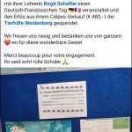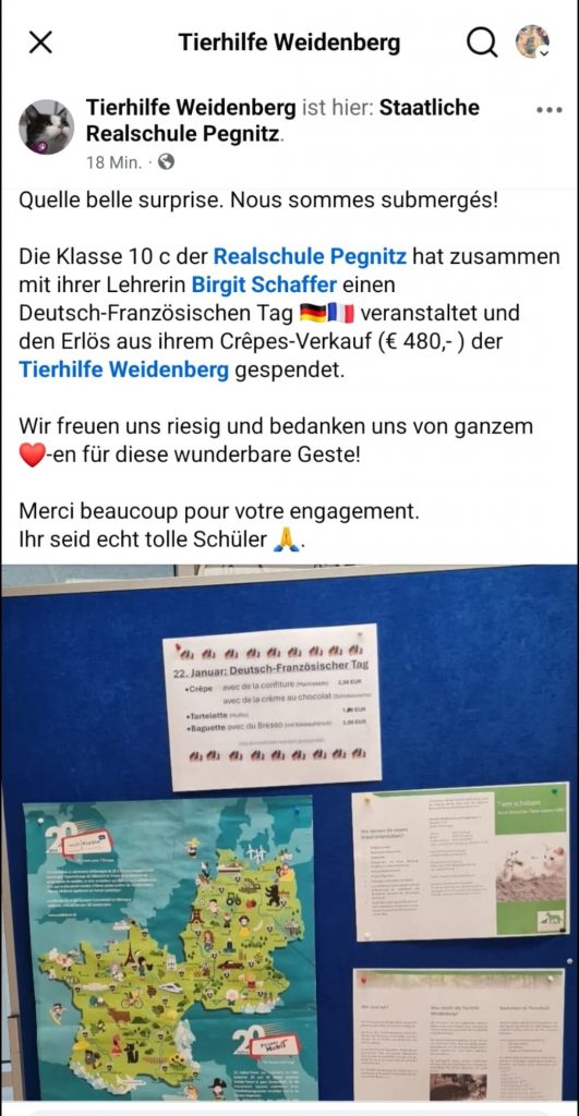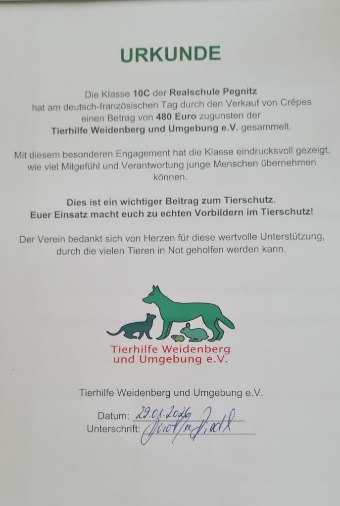 Die Einnahme aus dem Verkauf (480 EUR) wurden auf Vorschlag der Klasse komplett an die Tierhilfe Weidenberg gespendet, die sich riesig über das Engagement der Schüler und Schülerinnen gefreut hat.
